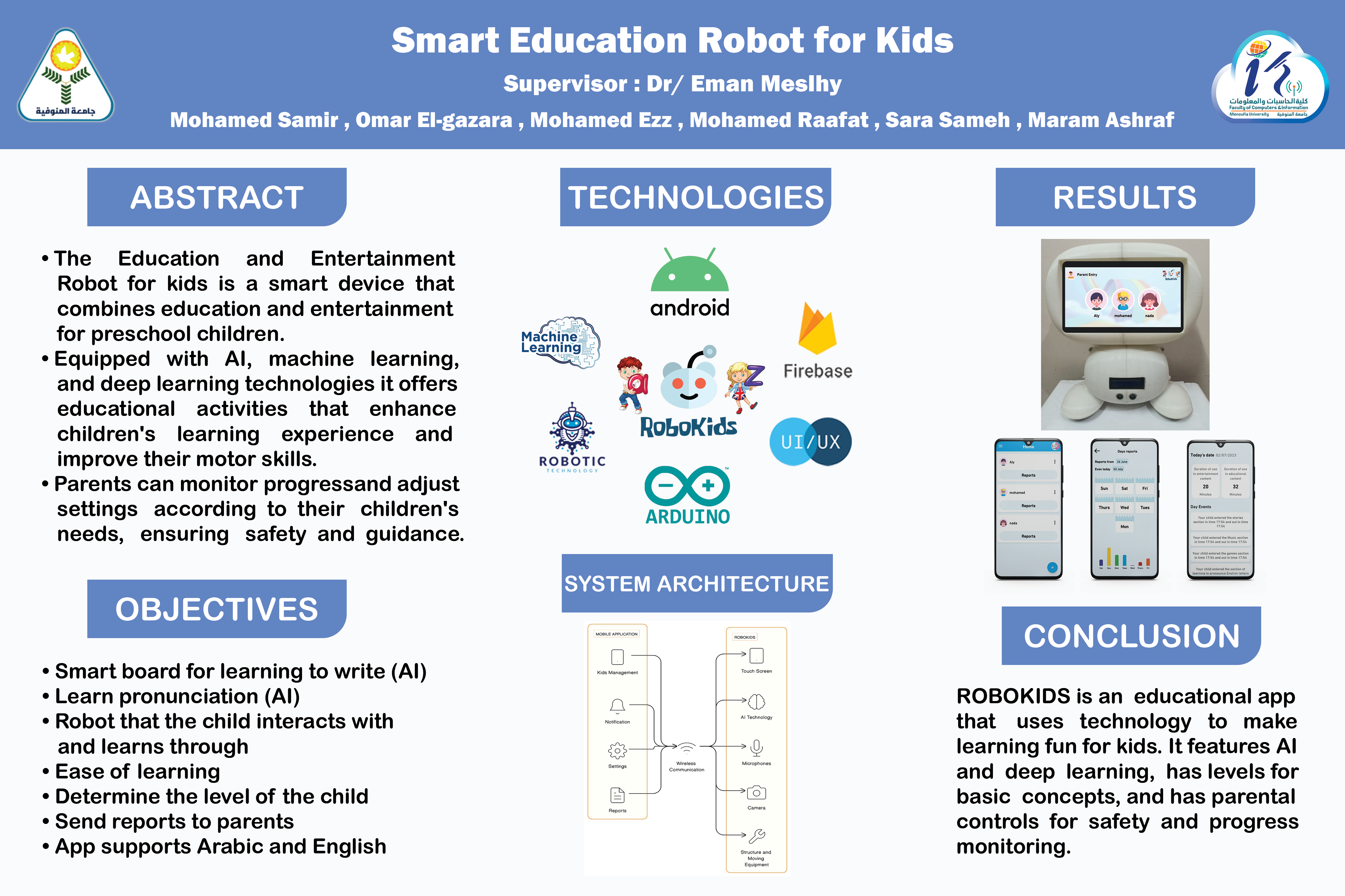 This is my graduation project, and it is about a smart educational application for children, and this application contains a lot of features and is divided into two parts, a part for parents and a part for children .. where the part of parents can register within the application and add their children within the application. Parents can access it and know their children's use of the application and track them while they are using the application, and we know how much time they spent in each of the educational and recreational sections ... And the children's section is divided into two parts, an educational section and an entertainment section.