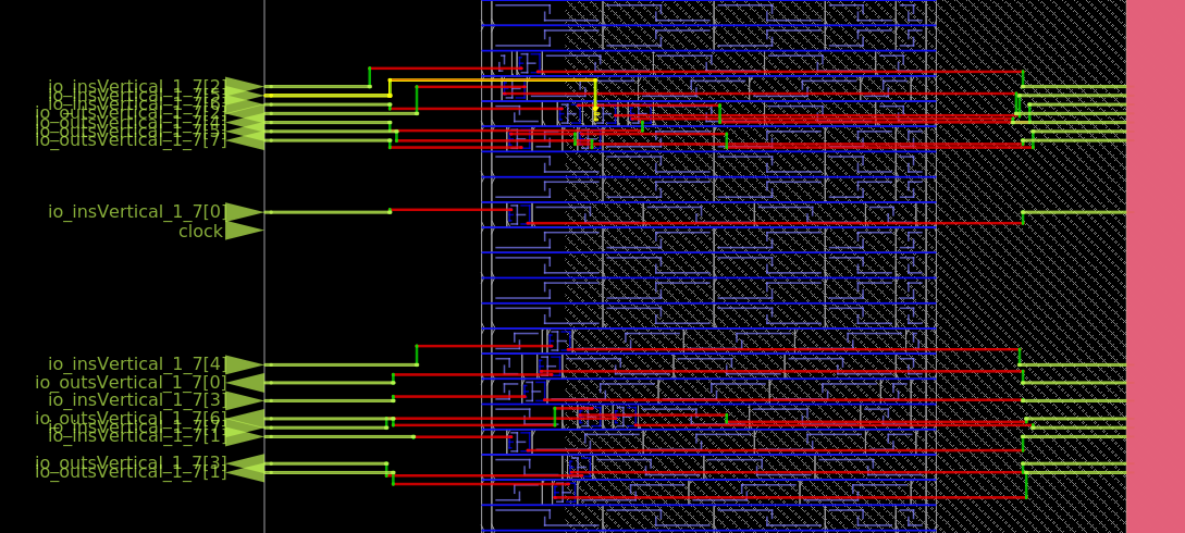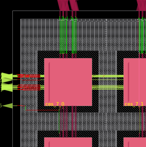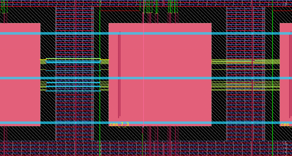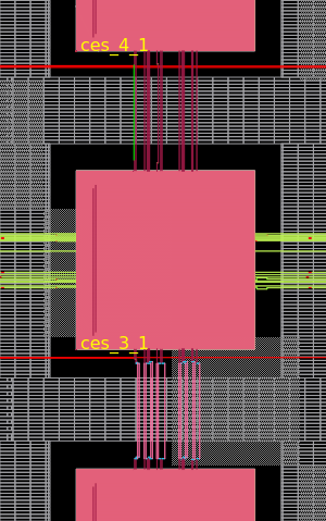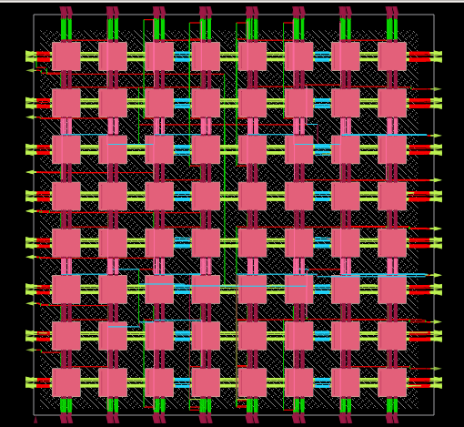 Here we can see routing in a straight line without changing metal layers between the elements, but not at the edges of the array: