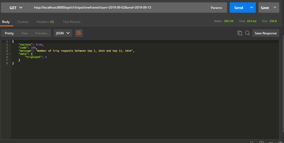 …t of trips made in last x timeframe - [x] Write test - [x] Validate timeframe(start and end date) - [x] Modified seeders - [x] Create a method that count trip request by time frame - [x] Create a route handler - [x] Write document with swagger [Finishes #167891607]