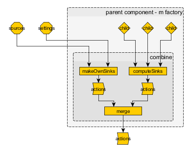 localSettings, settings which are only applied locally, i.e. formakeOwnSinks, and not passed down to the children. That would allow to customize those own sinks as a function of the settings from construction time (inherited from parent and ancestors) at runtime. Settings for now are inherited asparent <- grand parent <- ... patriarch.