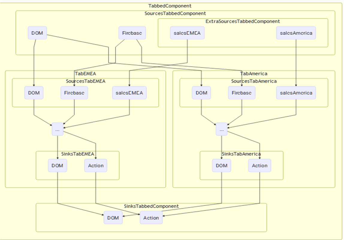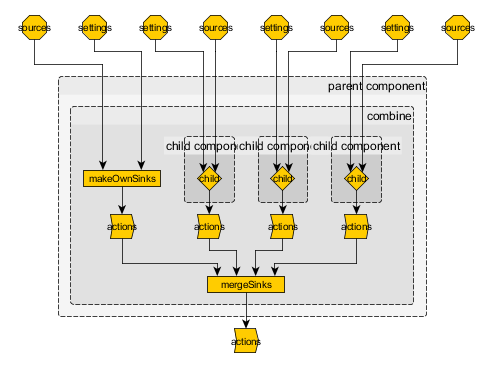 This component allows to create events from event sources. For ease of reasoning and maintainability, the created events should be coupled to the DOM representation generated by the children component. There is however no enforcement of such property. The created events will be mixed with the sinks returned from the children components.