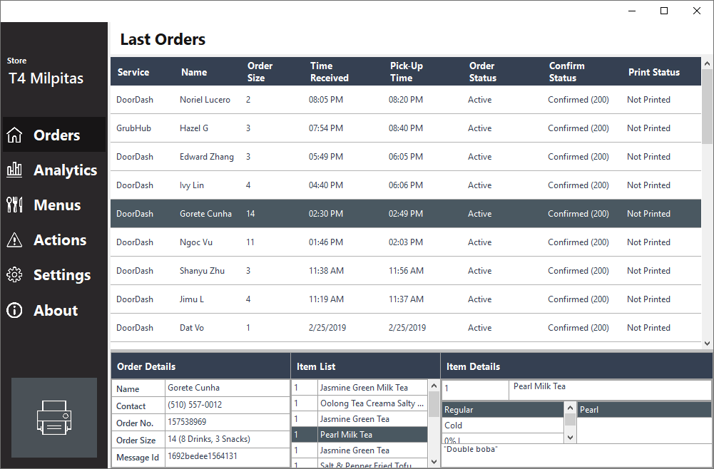 This application streamlines the process of preparing online orders at T4 Milpitas by enabling workers to view orders from different services such as DoorDash and GrubHub, in a single interface, and allows these orders to be easily printed to labels with a click of a button. Therefore, not only does this solution eliminate the possibility of human errors from workers having to maintain mental overhead from constantly switching between reading the order in the email that can span multiple pages, and entering the order in the POS machine, but also, this app significantly improves the efficiency of the store by allowing workers to immediately begin preparing the order.