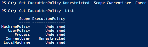 Set-ExecutionPolicy Unrestricted -Scope CurrentUser -Force