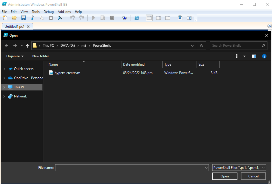 Get-ExecutionPolicy -ListB2. At the PowerShell ISE, navigate to File, click Open then select the provided PowerShell script (hyperv-createvm.ps1).