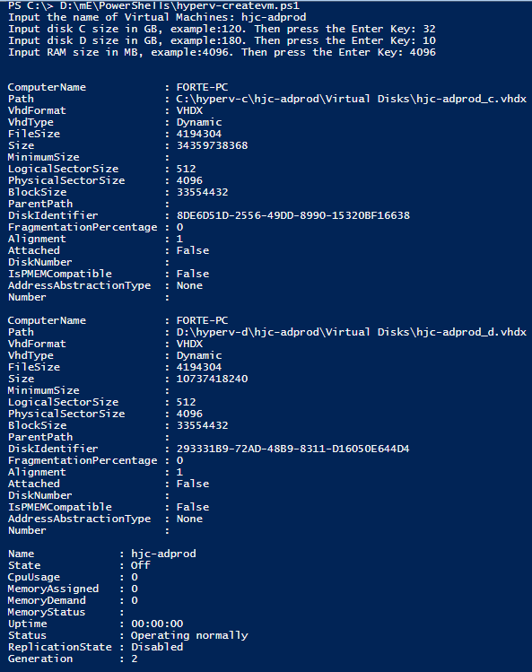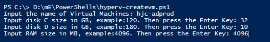 B4. Type in the name of the virtual machine, size of Disk C & D, and the Memory of the Virtual Machines. I've created first the "hjc-adprod" virtual machines, set the size of Disk C & D to 32 GB & 10GB, and Memory to 4096 MB or 4GB, respectively. Press enter and wait till the process complete.