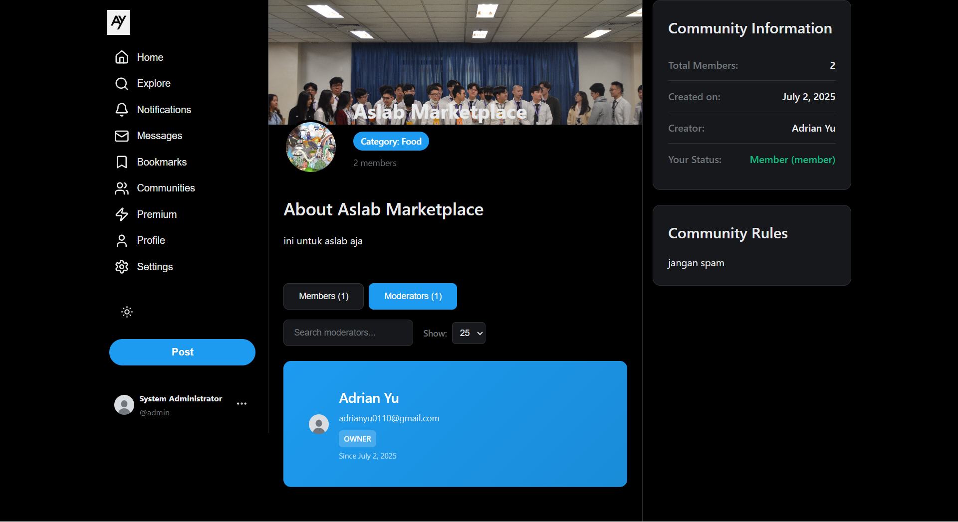 The application supports user authentication, posting, commenting, likes, and community creation.