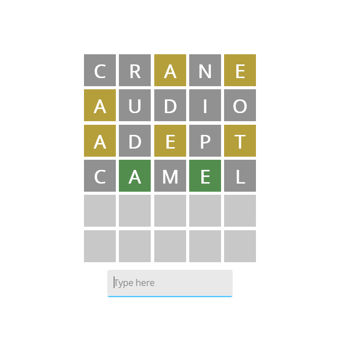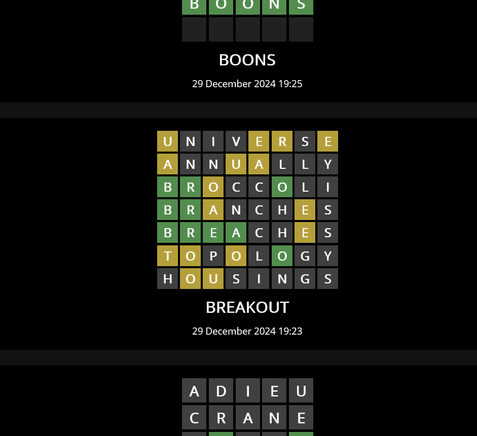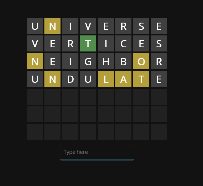 Wordle implementation in C# using .NET MAUI Features Play with 3-8 character words View history of past games Cross platform (Android, Windows) Light mode and dark mode Screenshots