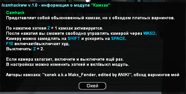Доработанный камхак sanek'a, добавлена менюшка с детальными настройками и обход варнингов. Т.е. другие игроки, установив специальный софт, не смогут задетектить у вас использование камхака.