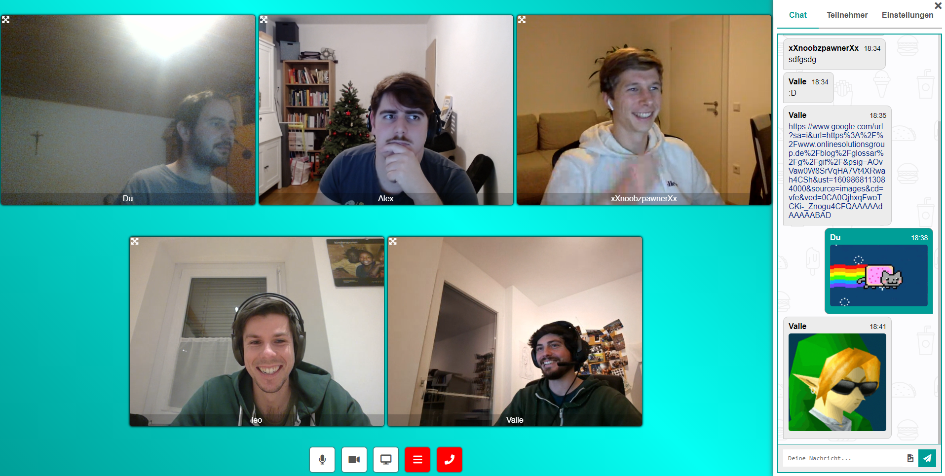 }Additional STUN / TURN Server can also be added in communication/webrtc/iceServers. To use this video chat behind some Firewalls and NATs, you need a TURN server.