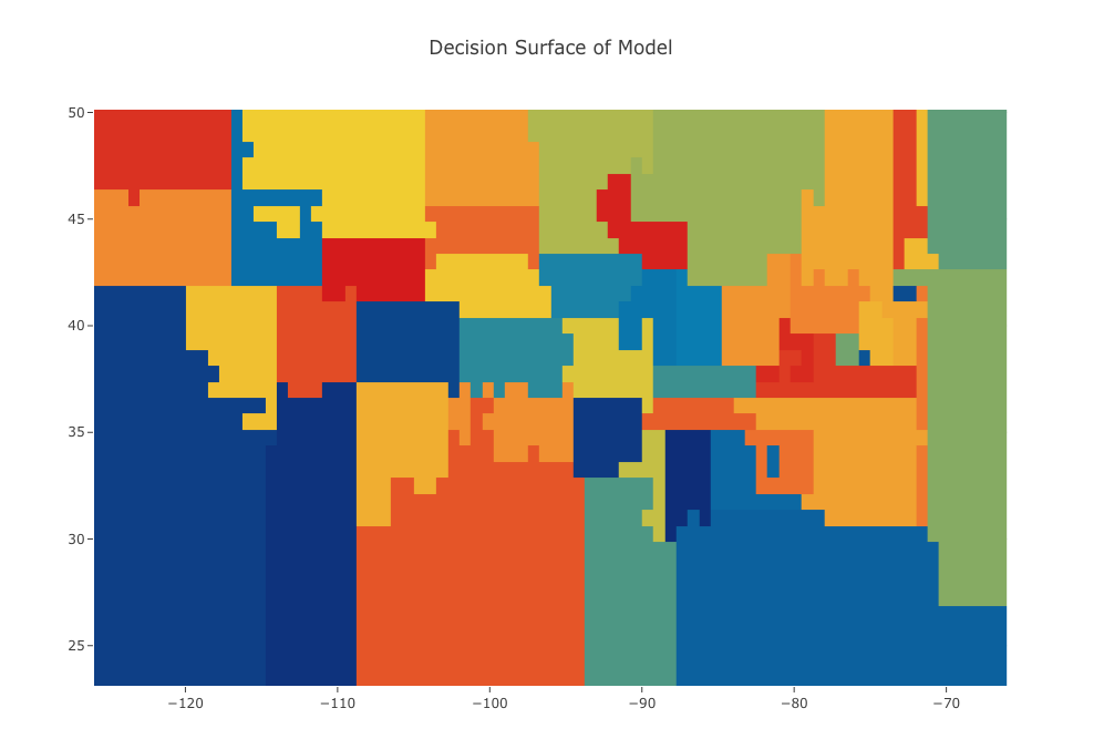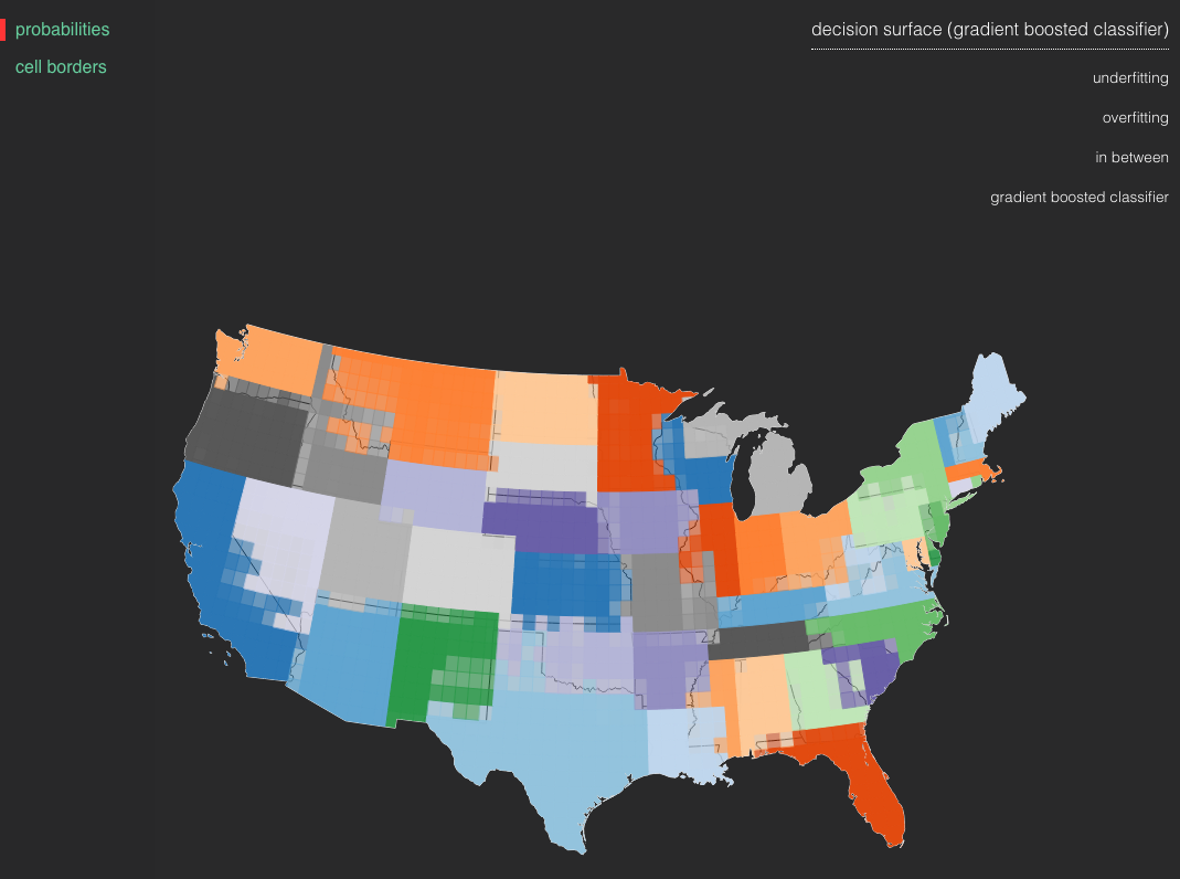 A visual example of the concepts of under and overfitting in supervised machine learning using U.S. state border data provided by the U.S. Census Bureau.